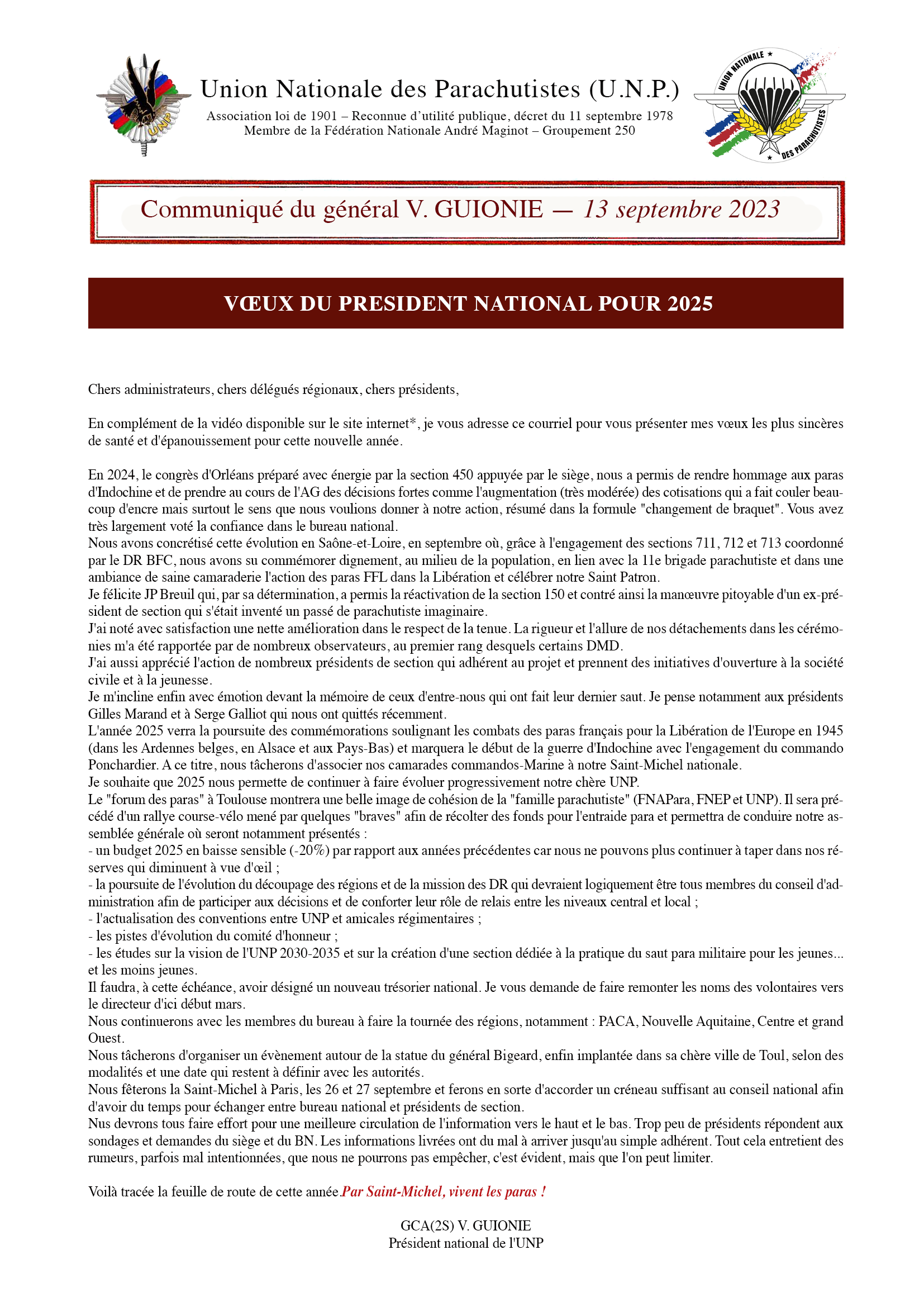 • Retrouvez la vidéo des voeux de notre Président National pour 2025 • Procès-verbal du Conseil d'Adminsttration national du 8 octobre 2024 • Mesage du Général Guionie aux présidents dee sections, le 14 octobre 2024 • Mesage du Général Guionie pour les cérémonies de la fin de la guerre d'Indochine • Mesage du Général Guionie pour les cérémonies du 19 mars • Mesage des voeux du Général Guionie pour l'année 2024 • Mesage du Général Guionie pour les commémorations de l'attentat du Drakkar • Message du Général Guionie pour la Saint Michel 2023 et pour les cérémonies nationale et local